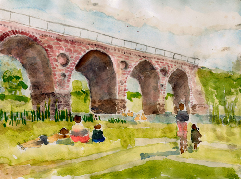 Aber hier zwischen Badeanstalt und einer Eisenbahnbrücke mit großen runden